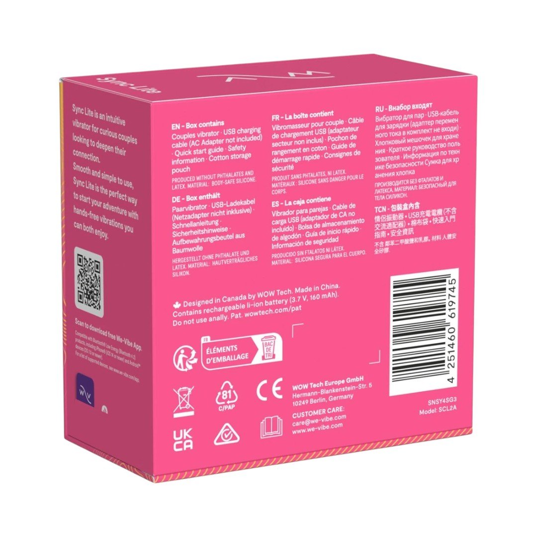 We-Vibe Sync Lite – painduv paarivibraator, mis toob vahekorra ajal topeltstimulatsiooni: sisemine haru hellitab G-punkti, välimine toetub kliitorile. „Lite“ on kergem ja õhem kui klassikaline Sync, sobitudes lihtsasti erineva anatoomiaga. Kaks vaikset mootorit, mitu vibratsioonimustrit ja intuitiivne juhtimine loovad rütmi, mis püsib paigal ka liikumise ajal. Veekindel korpus, kehasõbralik silikoon ja magnetlaadimine tagavad mugava kasutuse igal sammul.