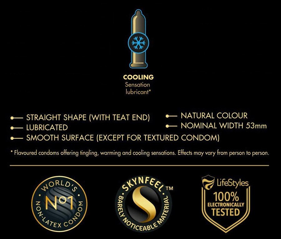 SKYN Cooling lateksivabad kondoomid. See on uudis SKYN kondoome ja libesteid tootvalt ettevõttelt Ansell. Kasutades neid kondoome tunnete meeldivalt õrna kipitust ja erutavat jahedust. Nagu ka kõik teised SKYN kondoomid, on need toodetud mitte lateksist, vaid uuenduslikust polüisopreenist.