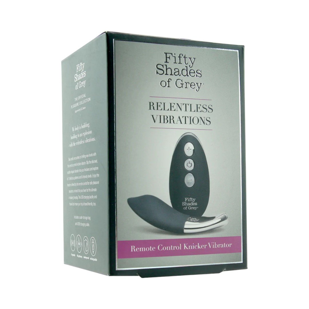 Fifty Shades Of Grey Relentless Vibrations Knicker Vibrator on püksikuvibraator, mis on loodud diskreetseks kliitori stimulatsiooniks ja mänguliseks paarikasutuseks. See sobib hästi neile, kes otsivad kantavat vibraatorit, mida saab kasutada aluspesus ning juhtida mugavalt kaugjuhtimispuldiga. Sadulakujuline vorm aitab mänguasjal paremini keha järgi asetuda, samas kui siidine silikoonpind muudab puudutuse pehmemaks ja meeldivamaks. Kui soovid Fifty Shades Of Grey kollektsiooni kuuluvat premium-tasemel püksikuvibraatorit, mis ühendab diskreetsuse, puldiga juhtimise ja tugeva vahelduse, on see väga ahvatlev valik.